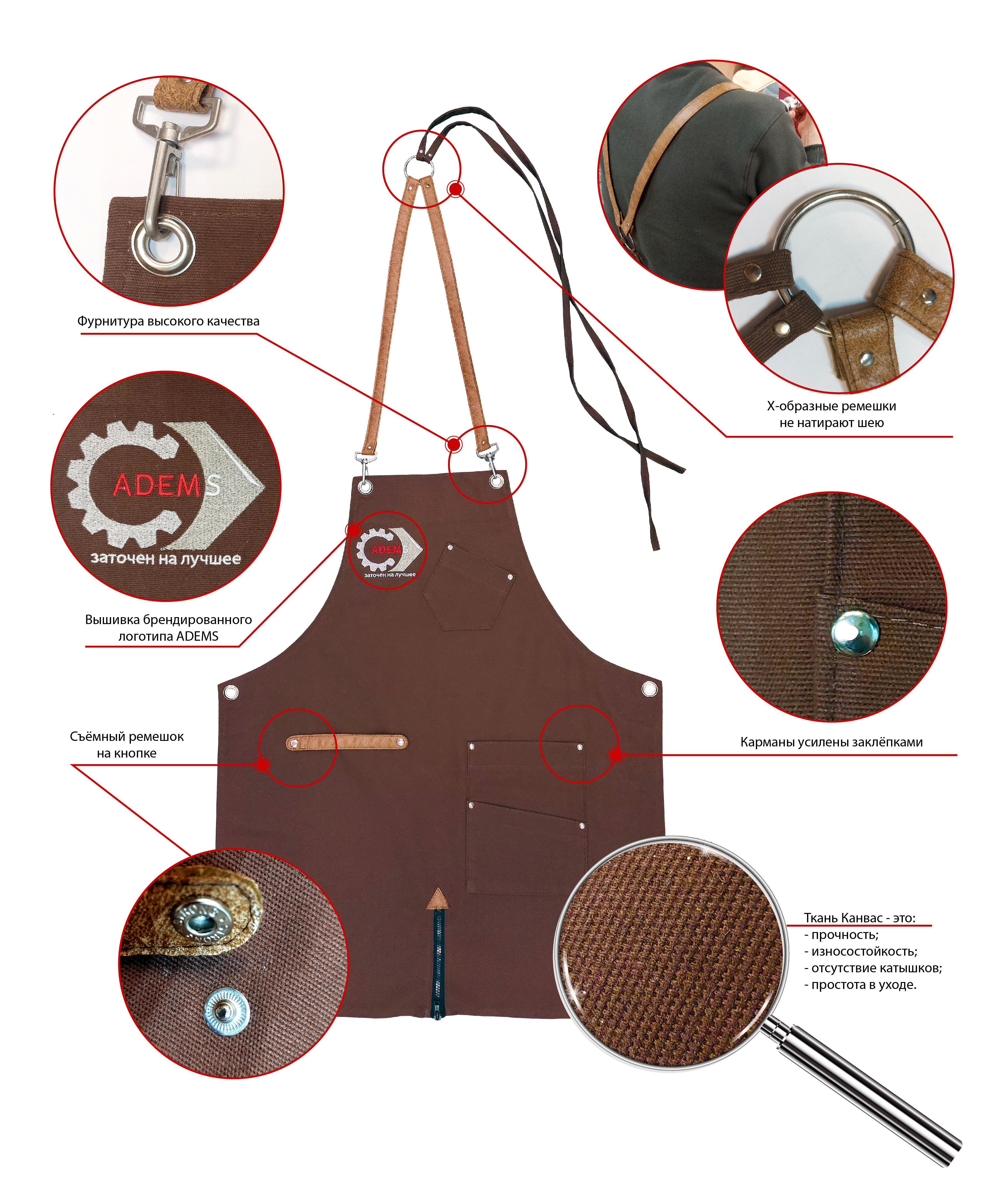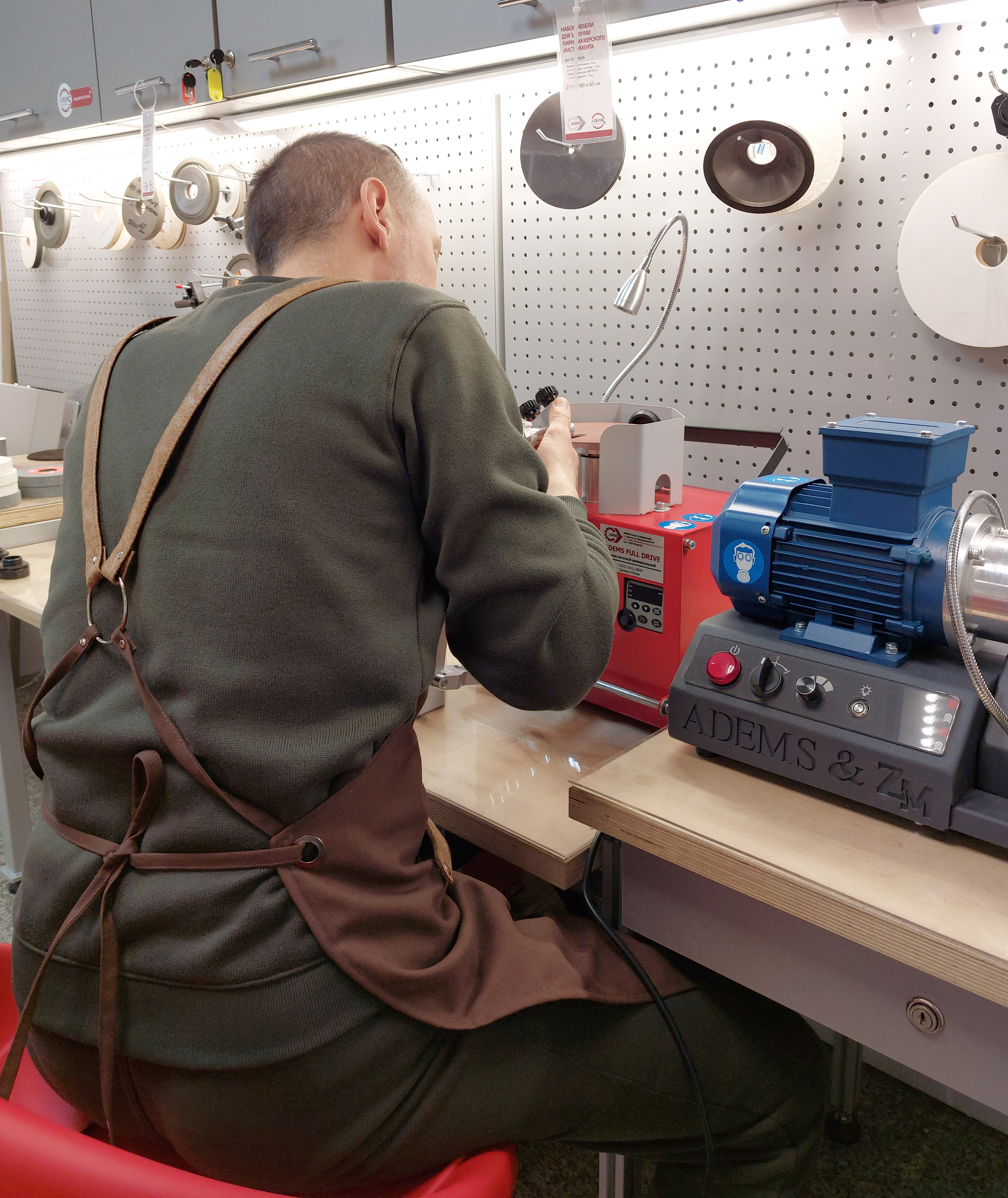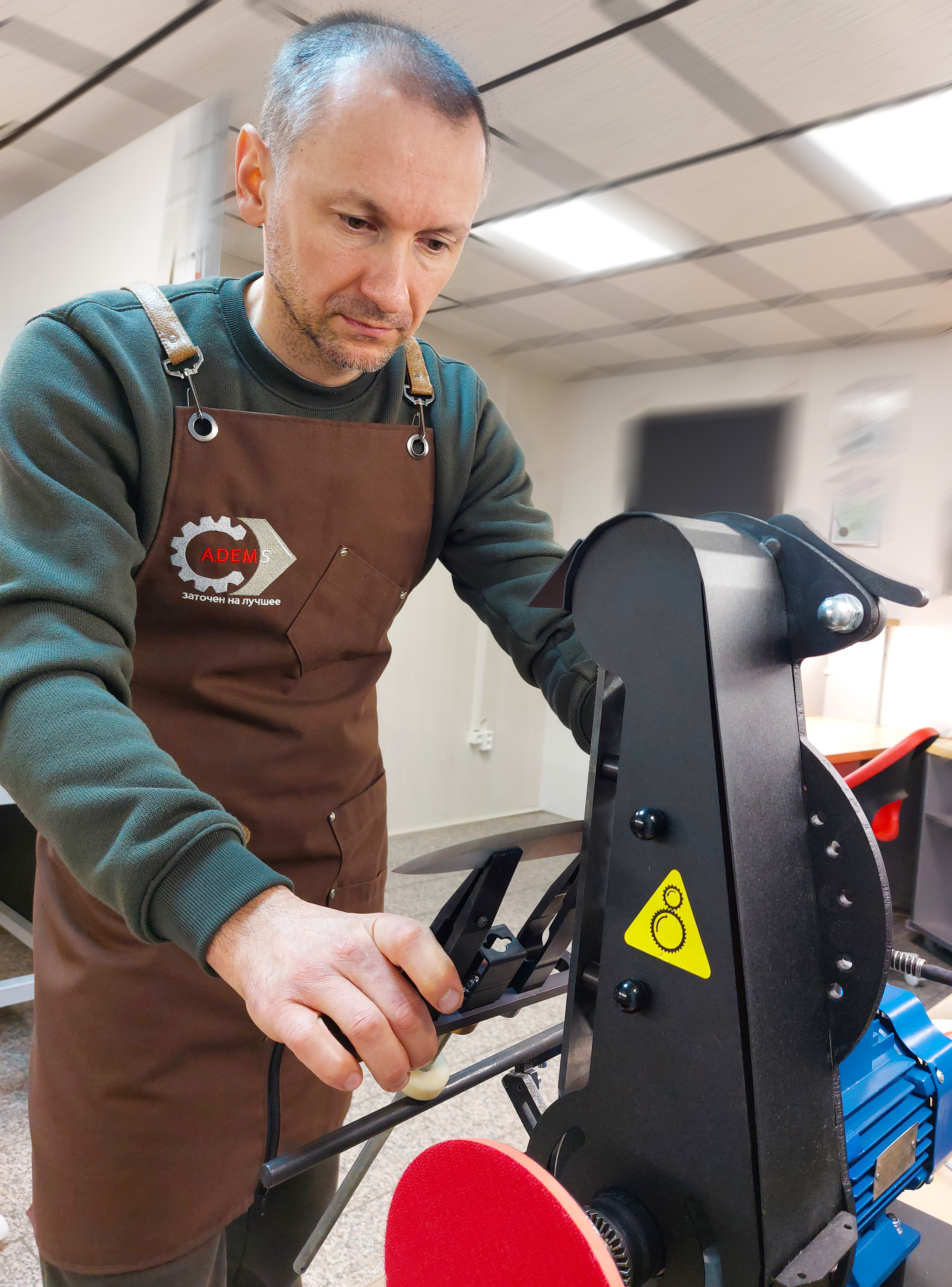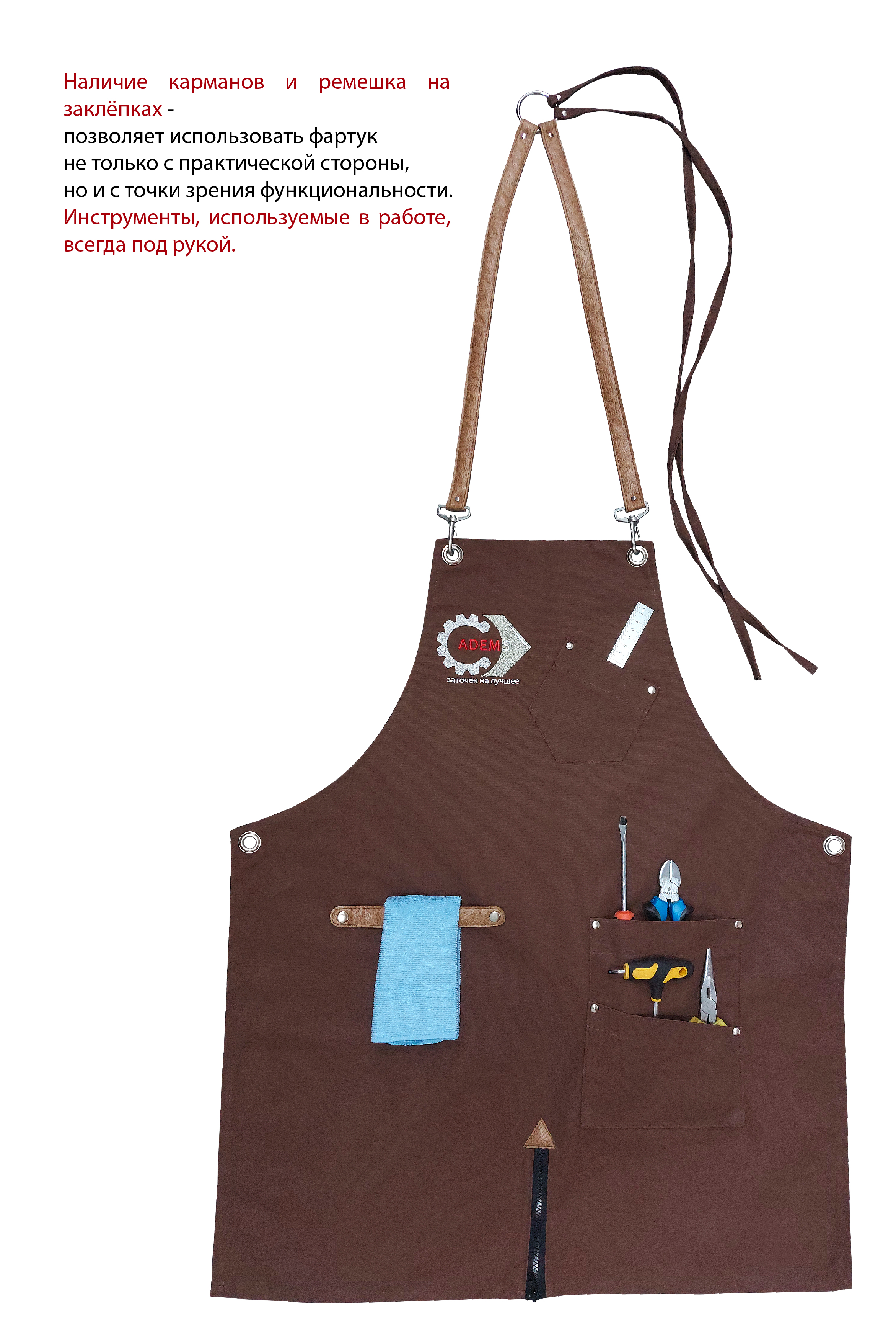 For convenient operation of the sharpener, the apron is equipped with pockets. Small, narrow ones are designed for pens, markers and similar items. A large pocket is convenient for reliable and comfortable temporary storage of the phone. The middle one is for the tool.