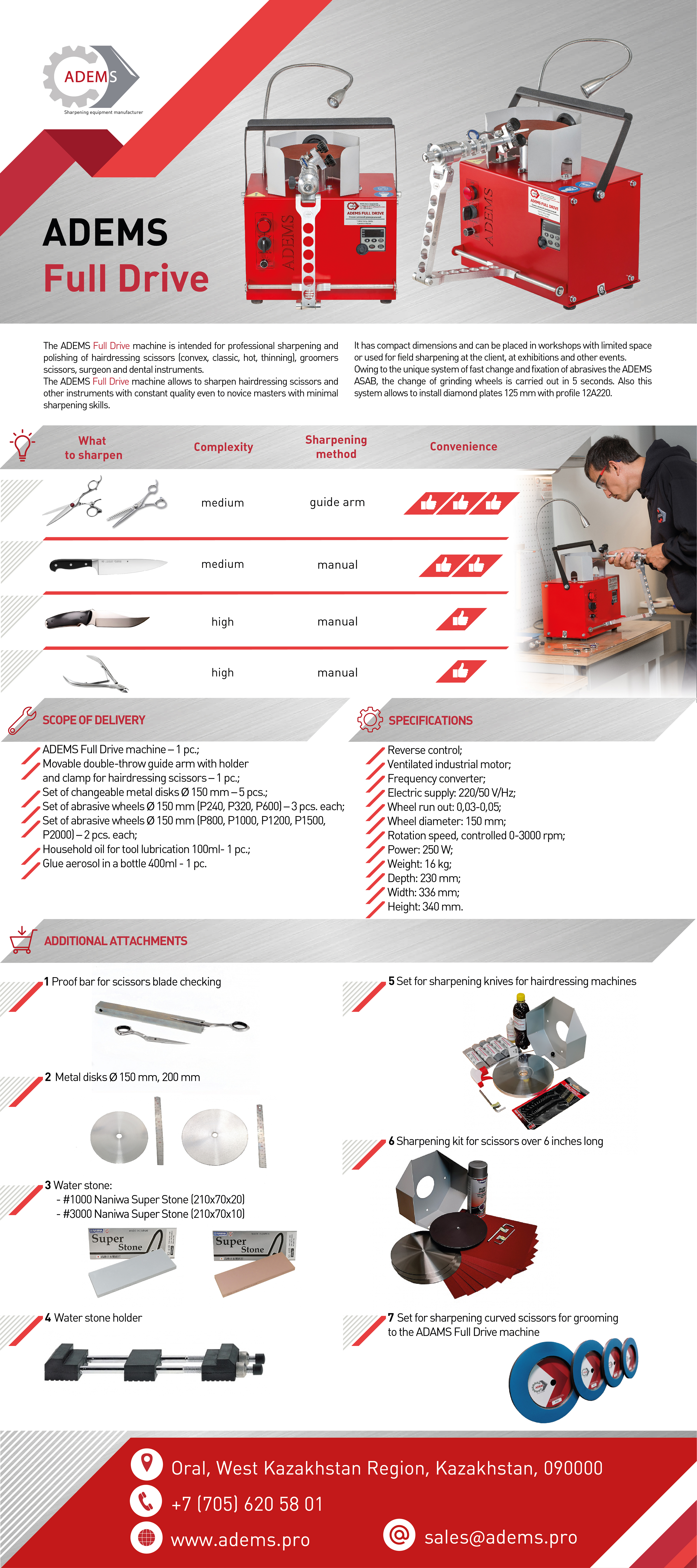 - A universal machine with a wide range of applications in the field of sharpening. ADEMS FULL DRIVE is intended for sharpening: classic hairdressing salons, convex and thinning scissors, as well as nail scissors and nippers, pushers, tweezers, surgical instruments, hairdressing and groomer's machine knives, meat grinder knives and grills.
