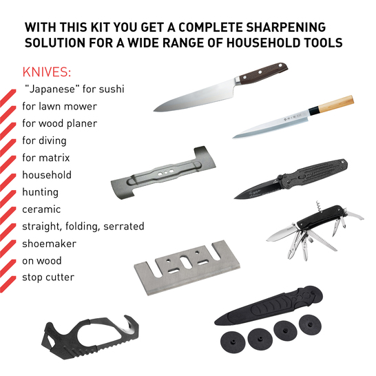 Mit diesem Set erhalten Sie eine komplette Schärflösung für eine breite Palette von Haushaltswerkzeugen: