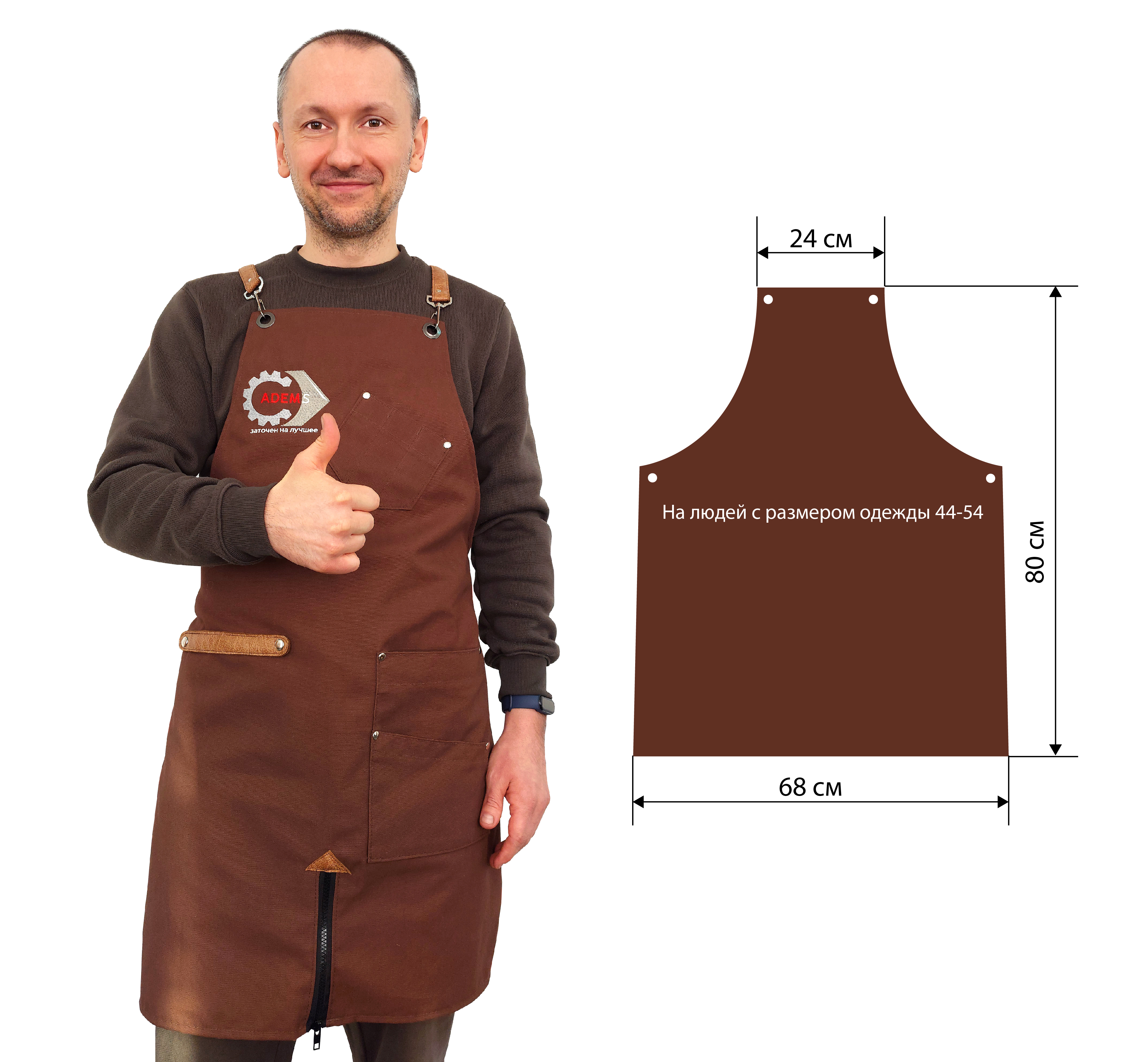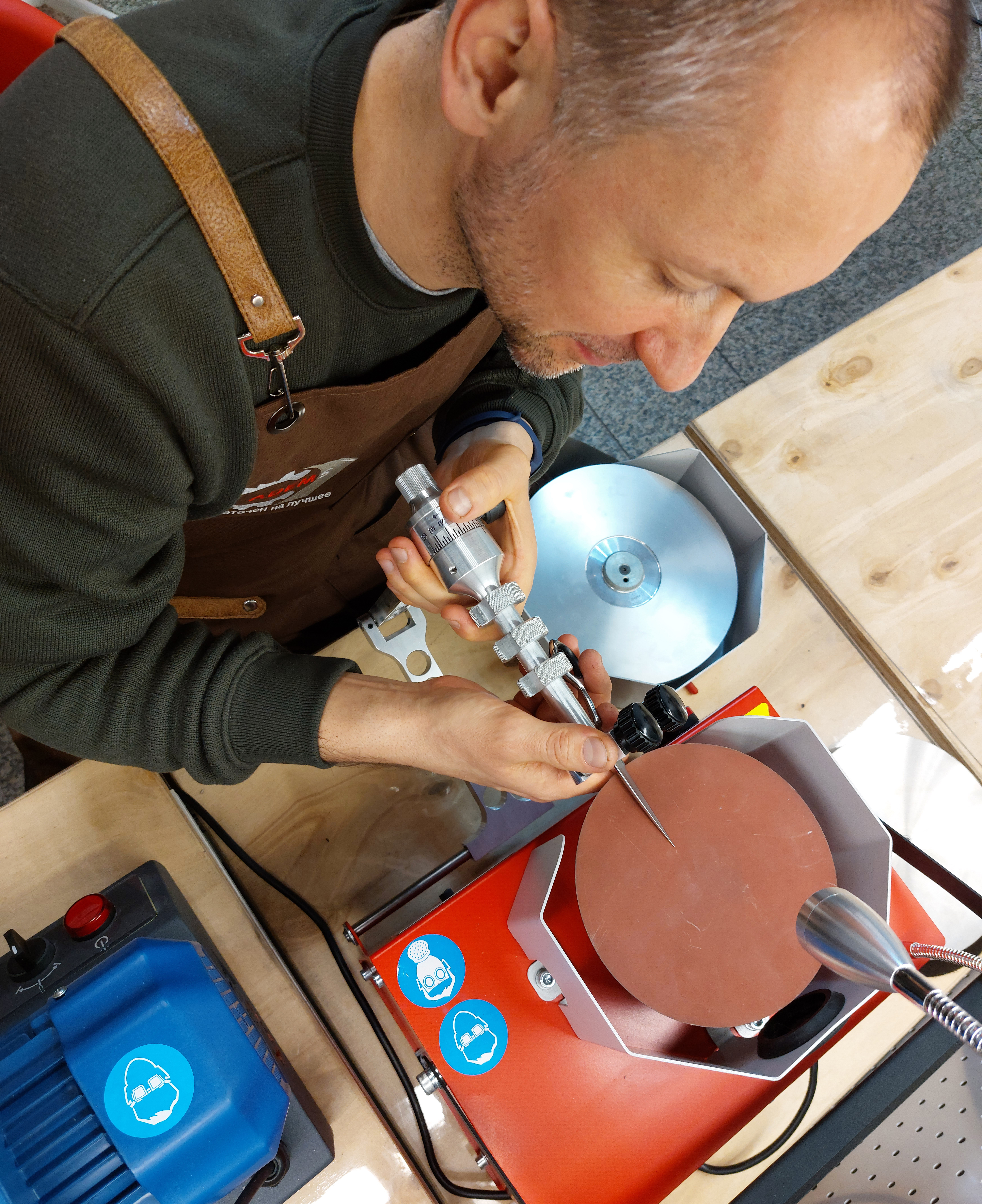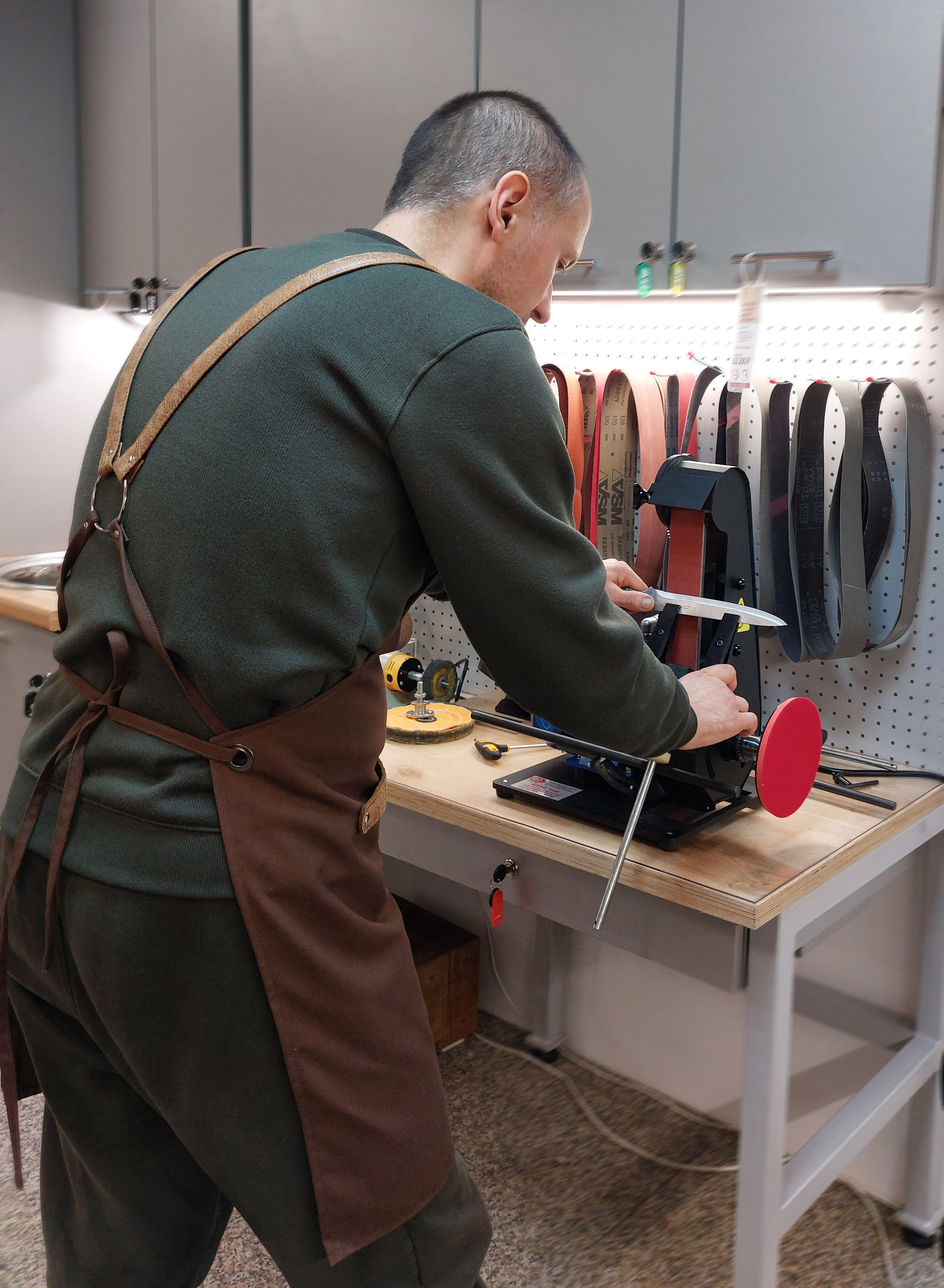 For convenient operation of the sharpener, the apron is equipped with pockets. Small, narrow ones are designed for pens, markers and similar items. A large pocket is convenient for reliable and comfortable temporary storage of the phone. The middle one is for the tool.